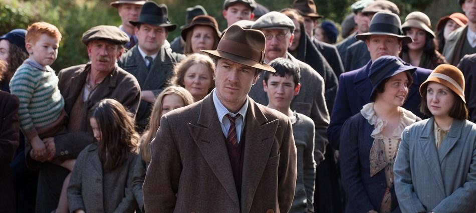 Después de unos créditos iniciales en los que imágenes de archivo de obreros negros durante la Gran Depresión en Nueva York se superponen a un fondo musical jazzístico, todo el contexto social necesario para comprender el marco de Jimmy’s Hall –aunque ciertamente nimio– se nos proporciona en tres rótulos que ya marcan lo que va a ser su deriva: se aporta información esquemática muy por encima de la construcción del personaje, lo que supone dar prioridad a la exposición del suceso sin otorgar apenas relevancia a los porqués. En el irlandés condado de Leitrim, Jimmy Gralton regresa de su exilio en Nueva York para reabrir un local comunitario de cuyas actividades culturales goza todo el pueblo. La temprana oposición de las autoridades religiosas, que ven en él un potencial peligro para sus intereses, no tarda en retratar a Jimmy como un héroe incluso antes de los hechos que le convirtieron en el único deportado político de la historia de Irlanda: las homilías son auténticos linchamientos públicos en los que, al revelador grito de “¡O Cristo o Gralton!”, el cura incita a los ciudadanos a alejarse de nuestro inocente y bonachón líder –hay incluso un montaje paralelo entre su discurso y uno de los bailes, no vaya a ser que, por lo que sea, pensemos que realmente hay actividades delictivas detrás de su persecución–. Y, efectivamente, Jimmy verá arrebatado el fruto de su trabajo a la par que el elemento cohesionador de un pueblo cuya pureza y unión frente al poder sirve para vertebrar el discurso de la película.